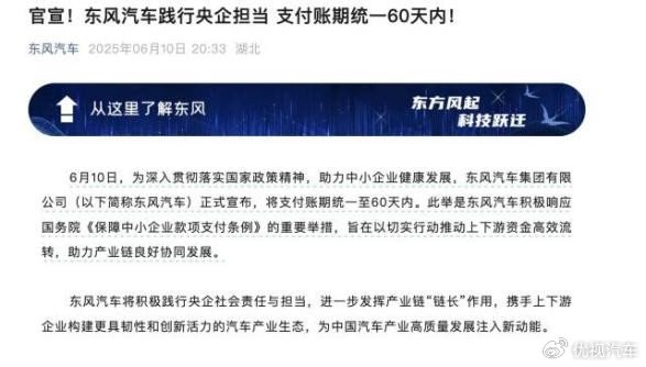 6月10日晚間,一汽、東風、廣汽、賽力斯、吉利、長安陸續宣布將供應商賬期統一壓縮至60天內。最先官宣的廣汽表示,“堅持以往不超過60天的供應商賬期”;一汽明確了“將60天付款作為所屬單位付款期限要求”;東風還特別強調了“積極響應《保障中小企業款項支付條例》”;賽力斯方面則表示“積極響應汽車工業協會發布的《關于維護公平競爭秩序 促進行業健康發展的倡議》”。