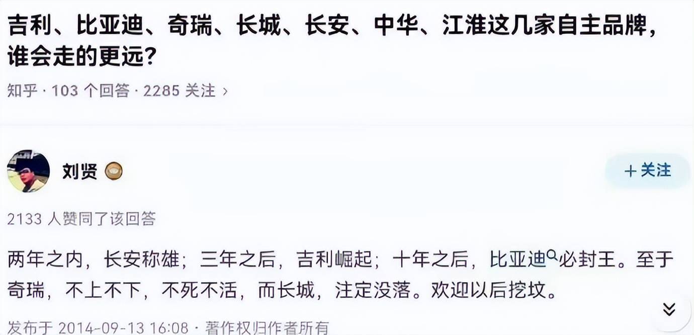 在那個跟隨和悲觀的年代,依然有一些對自主品牌充滿希望的小伙伴,透過一些品牌的“動作”,看到了10年之后,它們的境遇。2024年9月,在國內某知識問答網站上,有網友提出了一個關于當時幾家自主品牌誰會走得更遠的問題,提到了吉利、、奇瑞、長城、、中華、江淮等品牌。