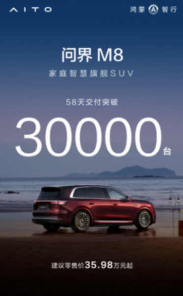 6月23日,CNMO注意到,華為聯合(134.170, 1.83, 1.38%)打造的家庭豪華SUV問界M8上市58天,取得了交付超3萬臺的成績。公開數據顯示,問界M8的銷量已超過2025款問界M9,成為了目前問界品牌的銷量主力。