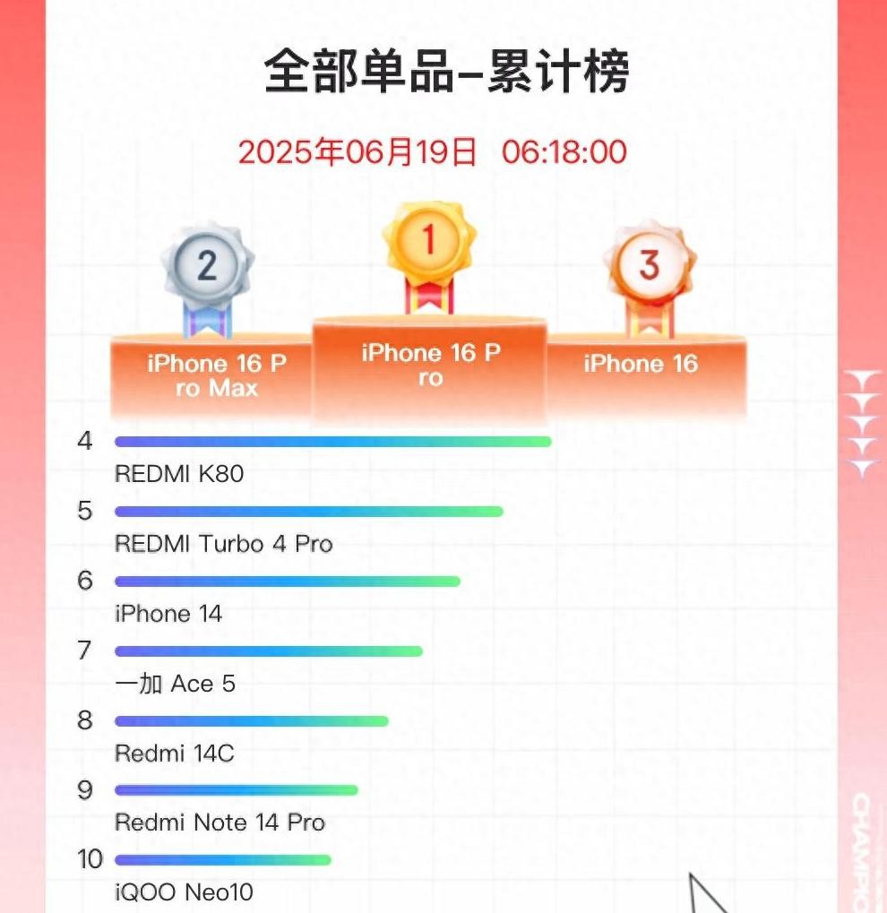618大促剛結束,銷量榜一出來,iPhone又把國產手機壓下去了。前三名全是iPhone 16!更狠的是,iPhone 14這個快三年的老手機,還在第六名上賣得火。網上天天喊國產吊打蘋果,可銷量一點不騙人。這結果直接捅破了一層紙:國產手機進步快,蘋果卻有硬本事沒倒。