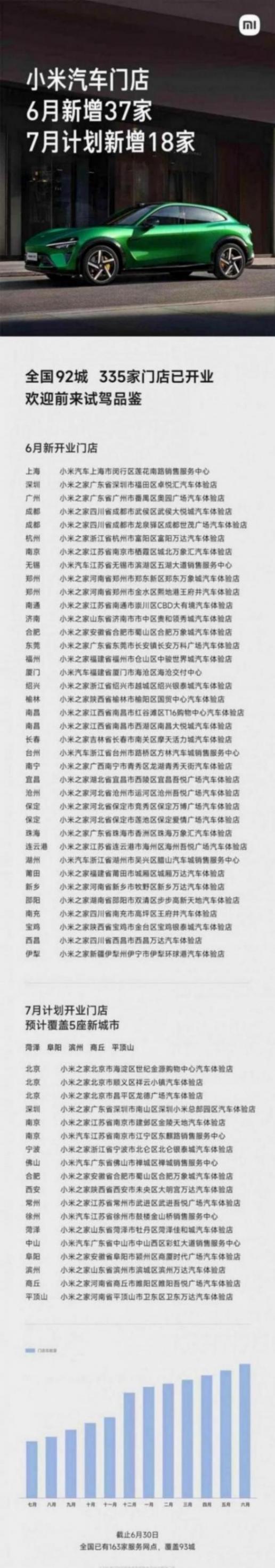 6月30日,小米汽車公布了其最新的門店擴張進展。6月份,小米汽車新增了37家門店,使得全國范圍內的門店總數達到了335家,覆蓋了92個城市。7月份,小米汽車計劃再新增18家門店,預計將覆蓋菏澤、阜陽等5座城市,進一步擴大其服務網絡。