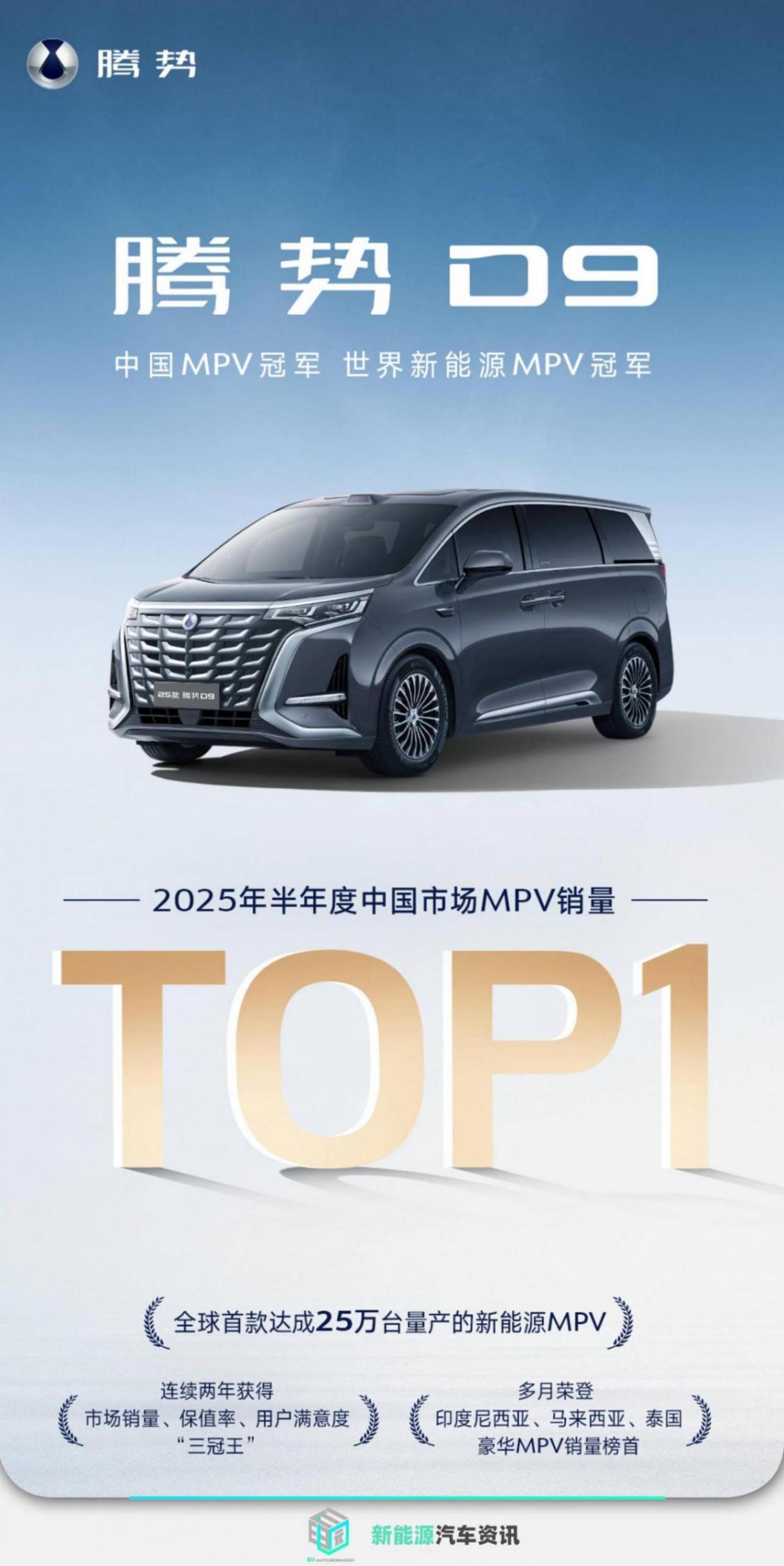 2025年以來,騰勢獲得了1-6月MPV全市場六連冠,同時(shí)獲得了40萬-60萬級(jí)中國品牌銷量冠軍。自2022年騰勢D9上市以來已經(jīng)達(dá)成了25萬臺(tái)新車下線。