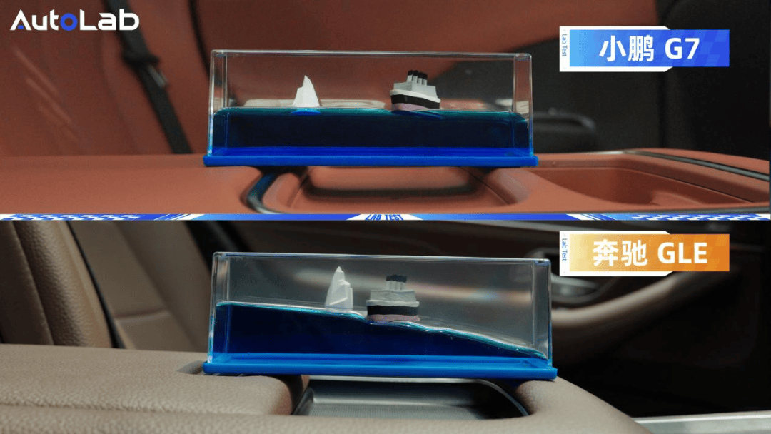 甚至兩車底盤顛簸曲線上的每一個波峰均能看出來,奔馳GLE的數值要略高于小鵬G7,這一點從我們實測畫面上也能體現出來,奔馳GLE駛過減速帶時,車輪相比小鵬G7要有更多的彈跳,車內展示道具畫面也印證了這一結論。
