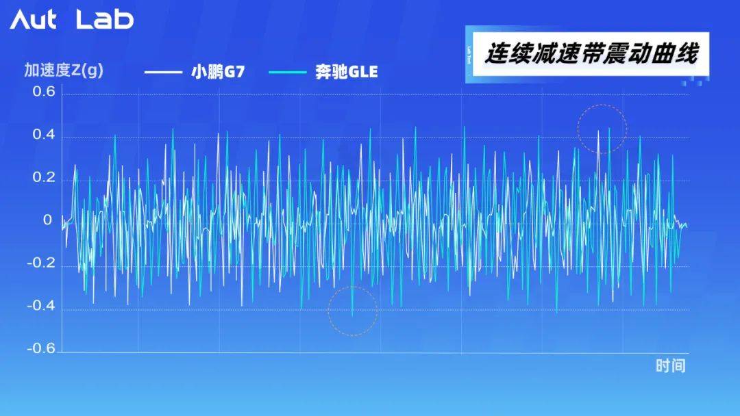 從兩車經過減速帶時底盤讀取的垂向加速度折線圖可以看出來,奔馳GLE在經過整個減速帶路面時,底盤所測量到的垂向加速度峰值要略高于小鵬G7。