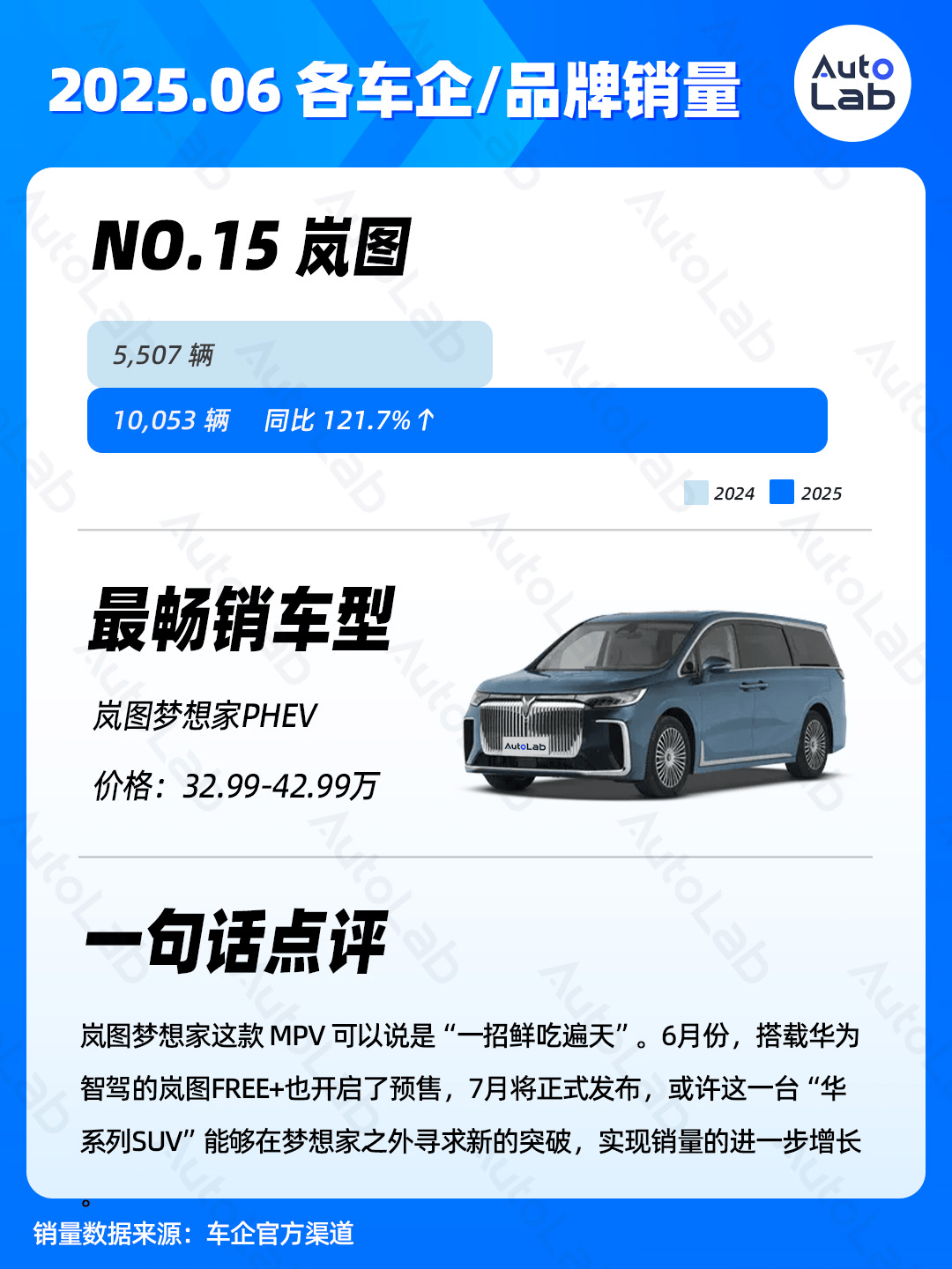 嵐圖6月份銷量依舊穩定破萬,本月,搭載華為智駕的“華系SUV”嵐圖FREE+也會正式上市,有望和嵐圖夢想家合力實現進一步增長。