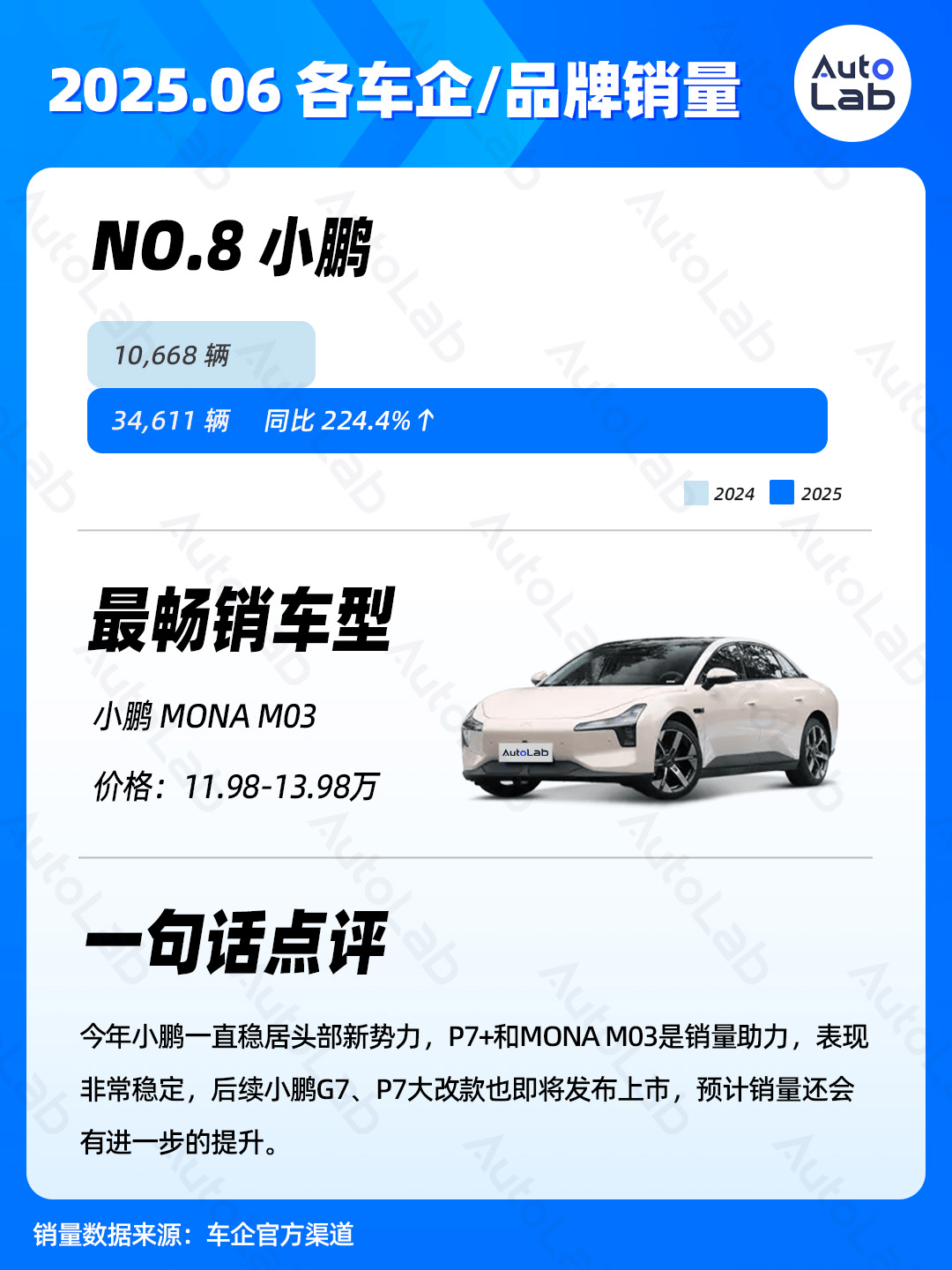小鵬依靠MONA M03與P7+兩款主力車型,依然保持這純電市場的領先地位。