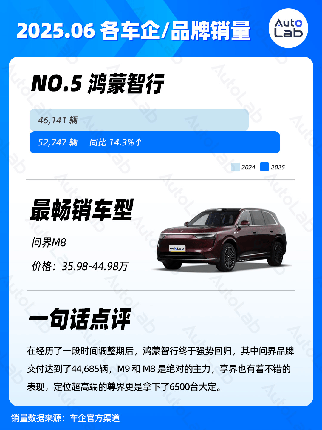 6月份,鴻蒙智行強勢回歸,四大品牌交付量達到了52747輛。