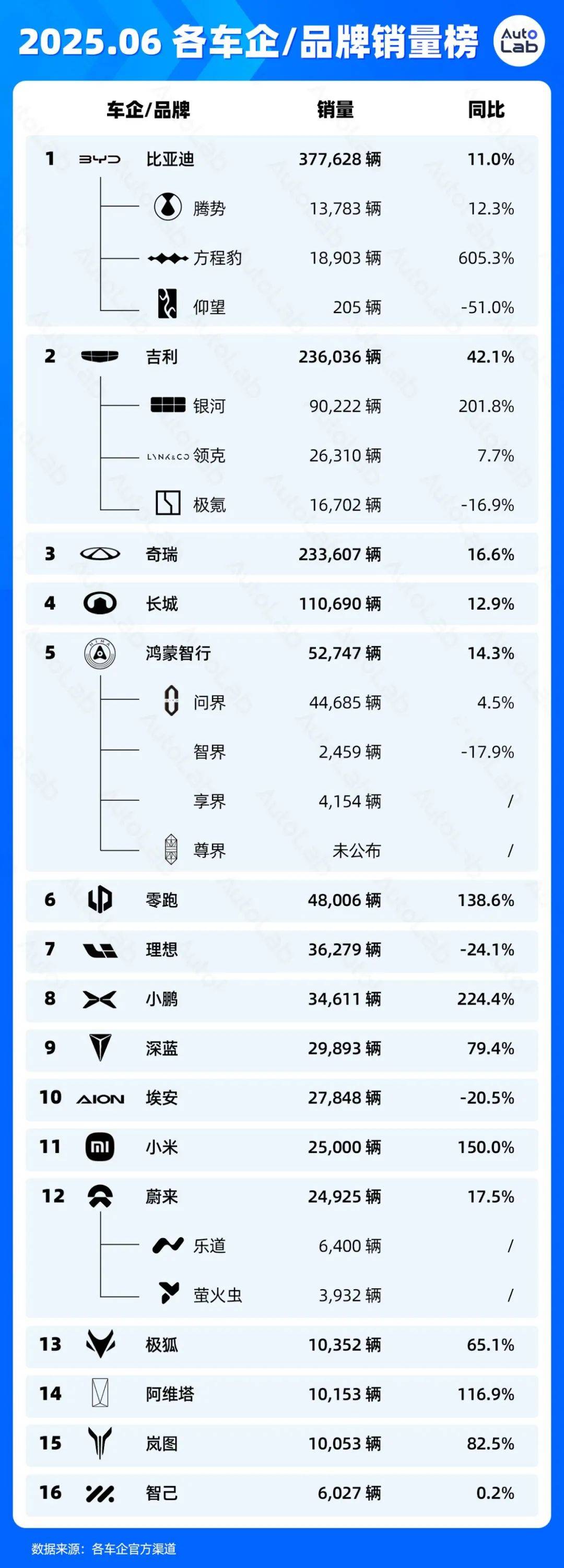 6月份的銷量榜如期而至,以下是截至7月2日,中國市場各車企或品牌的銷量排行。