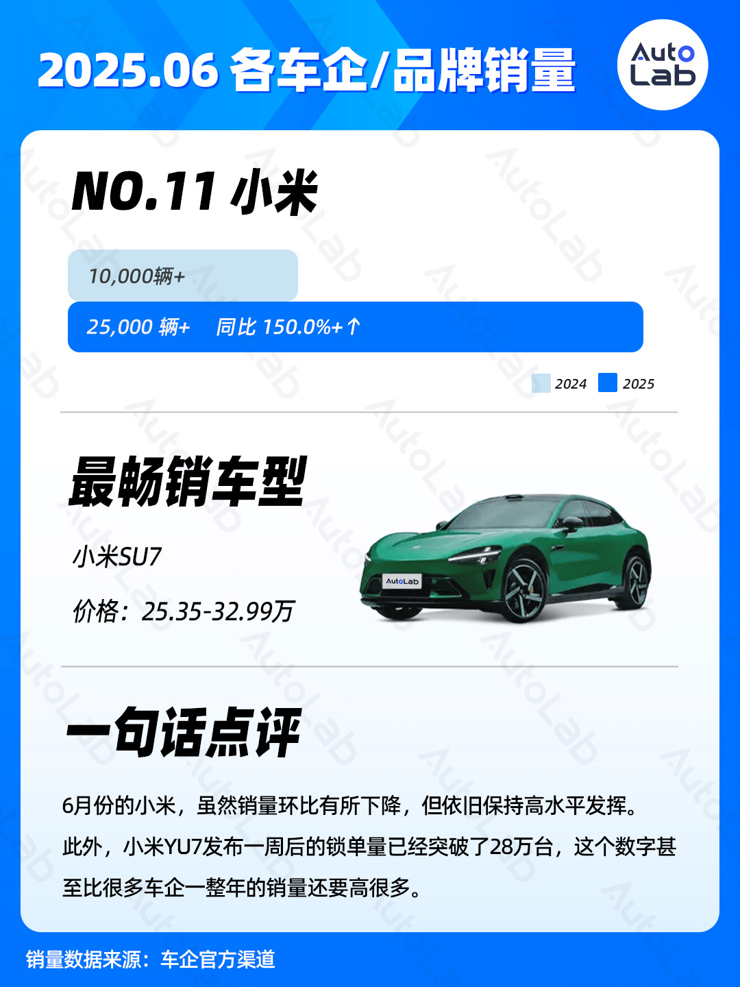 6月份的小米SU7交付量超25000輛,雖然相比上個月下降了3000臺,但依舊保持高水平發揮。