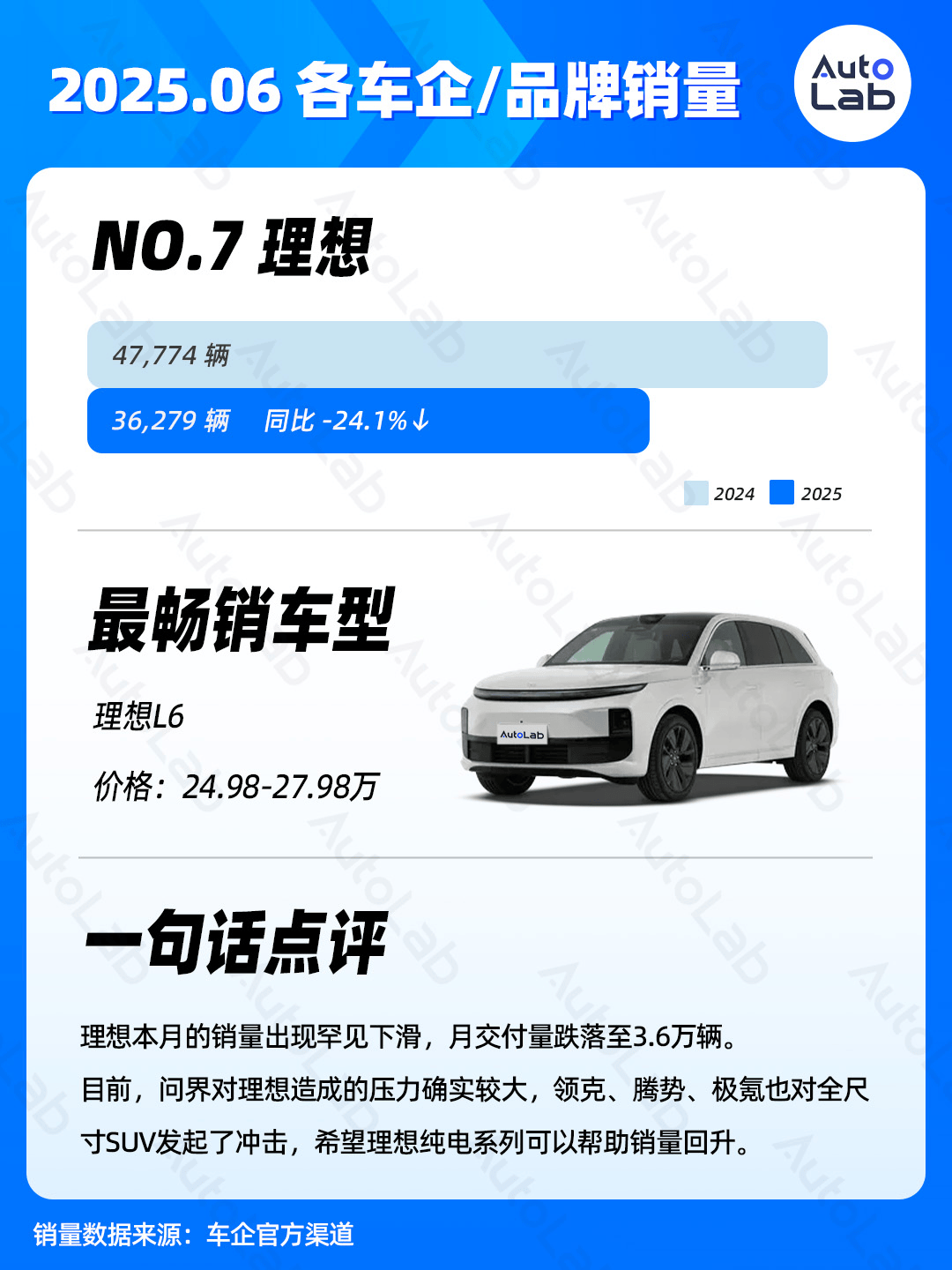 6月份,理想遭遇罕見下滑,上半年理想雖然推出了L系列智駕煥新款,但缺乏真正意義上的新車,加之問界M8、騰勢N9、領克900等全尺寸SUV爆款頻出,理想L系列的壓力是越來越大。