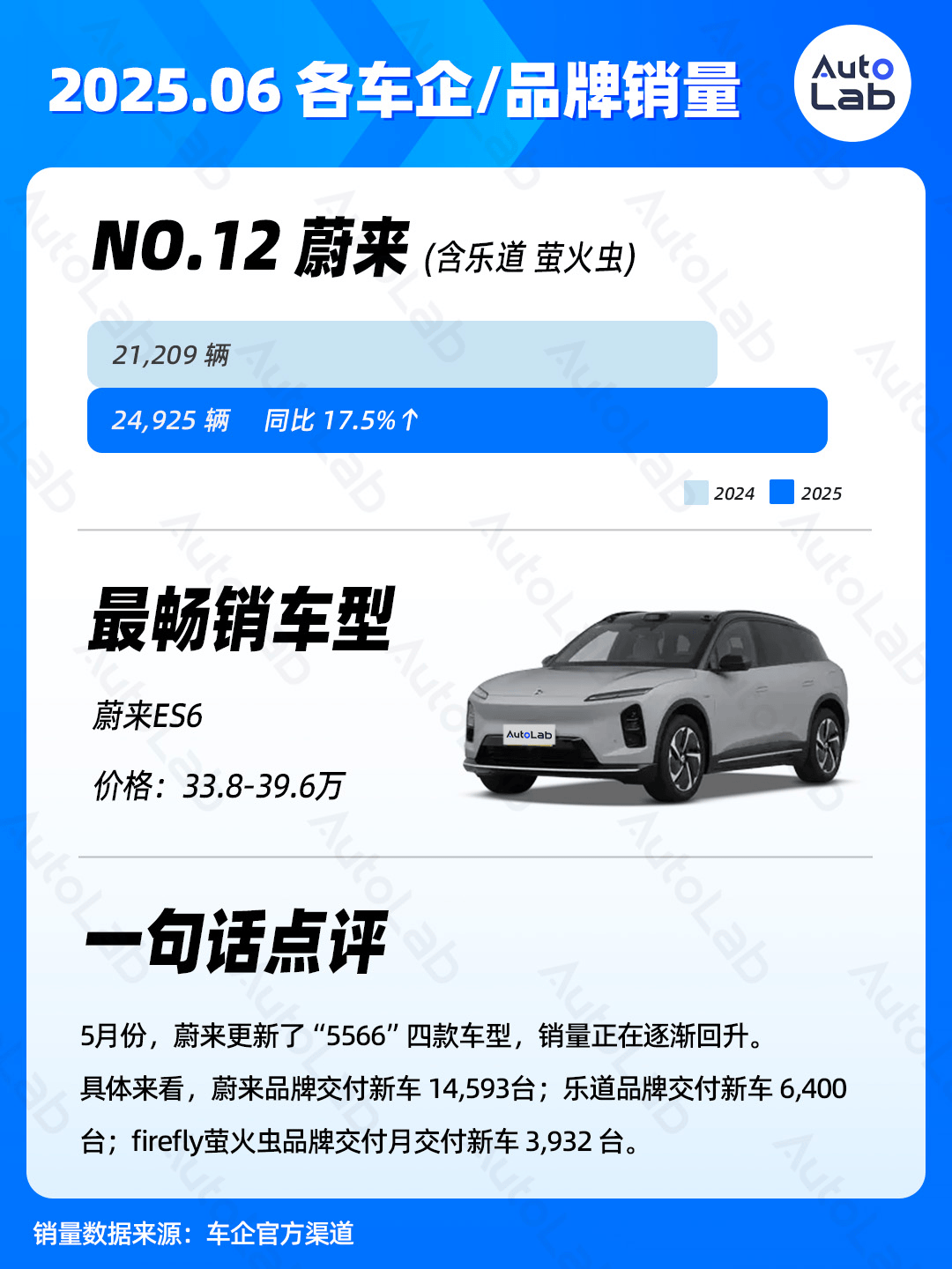 6月份,蔚來品牌交付新車 14593臺;樂道品牌交付新車 6400臺;firefly螢火蟲交付新車3932臺。
