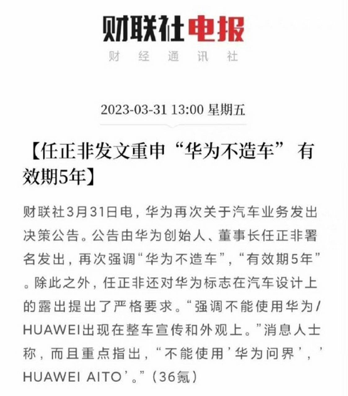 愚人節前一天,任正非動用董事長權限,給這份《華為不造車聲明》又續了5年,堅決重申了這5個字——華為不造車!甚至規定“不許使用華為問界,不許使用華為AITO等品牌LOGO”。