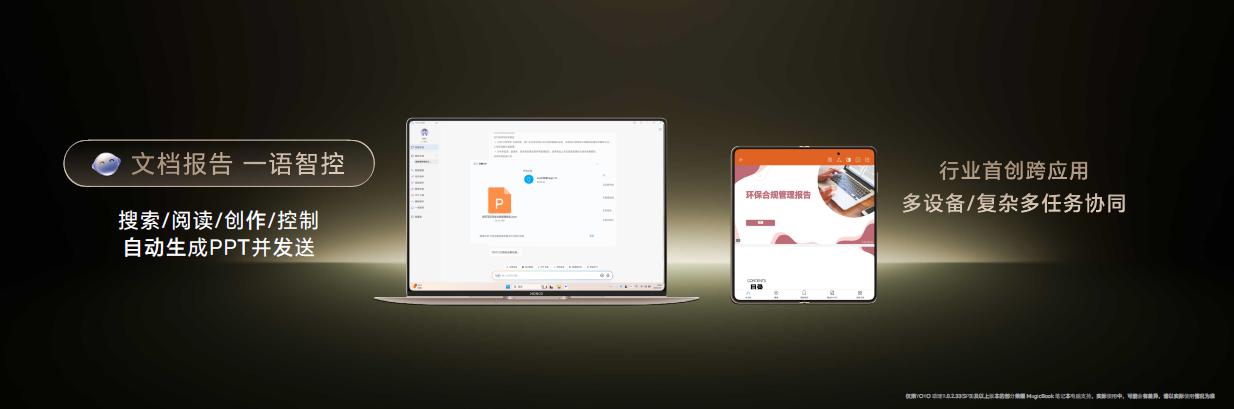榮耀MagicBook Art 14 2025帶來AI體驗(yàn)的突破性升級,YOYO助理全新上線一語智控功能,實(shí)現(xiàn)“搜閱創(chuàng)控”全鏈路多任務(wù)的一句話操作,開啟AI PC自動(dòng)駕駛時(shí)代。此次上線的智控功能,不僅涵蓋了亮度、音量調(diào)節(jié)等55類160項(xiàng)系統(tǒng)設(shè)置,還包括垃圾清理、病毒查殺等58類93項(xiàng)自研應(yīng)用控制,以及第三方應(yīng)用的下載、安裝,還有跨設(shè)備的文件傳輸。在此基礎(chǔ)上,AI智控還支持多設(shè)備復(fù)雜多任務(wù)協(xié)同,例如“搜索某某文檔,做SWOT分析生成PPT并發(fā)送到我的手機(jī)”,只需要一句話,即可輕松實(shí)現(xiàn)搜索、閱覽、創(chuàng)作、控制的多鏈路體驗(yàn)。