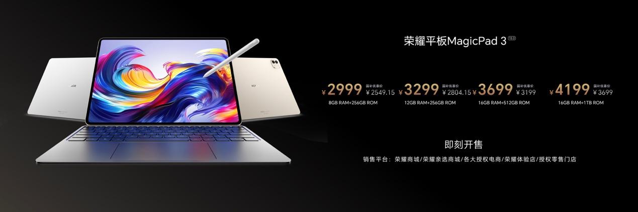 榮耀平板MagicPad3首發(fā)全局 AI 生產(chǎn)力,打造13.3英寸大屏旗艦最強(qiáng)AI平板,首銷國補(bǔ)優(yōu)惠價(jià)2549.15元起;