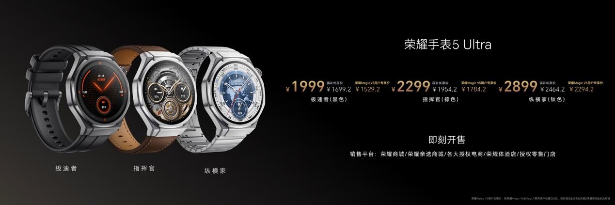 鈦合金藍(lán)寶石高端旗艦手表榮耀手表5 Ultra首發(fā)防猝篩查研究,24小時(shí)守護(hù)心臟健康,重新定義腕上智能健康,首銷國補(bǔ)優(yōu)惠價(jià)1699.2元起,榮耀Magic V5用戶專享優(yōu)惠價(jià)1529.2元起;
