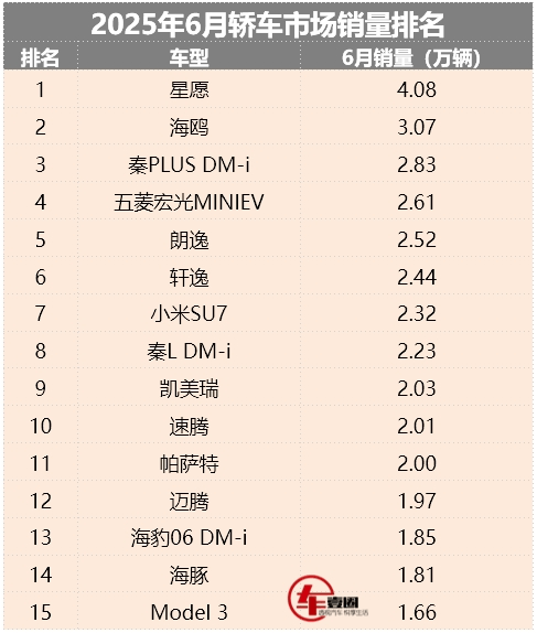 相較于5月份,6月轎車銷量排名也出現(xiàn)一些變化。其中,此前被看好的小米SU7排名出現(xiàn)退步。此外,吉利銀河星愿6月份銷量超4.08萬(wàn)輛,環(huán)比增長(zhǎng)5.4%,繼續(xù)坐穩(wěn)第一。