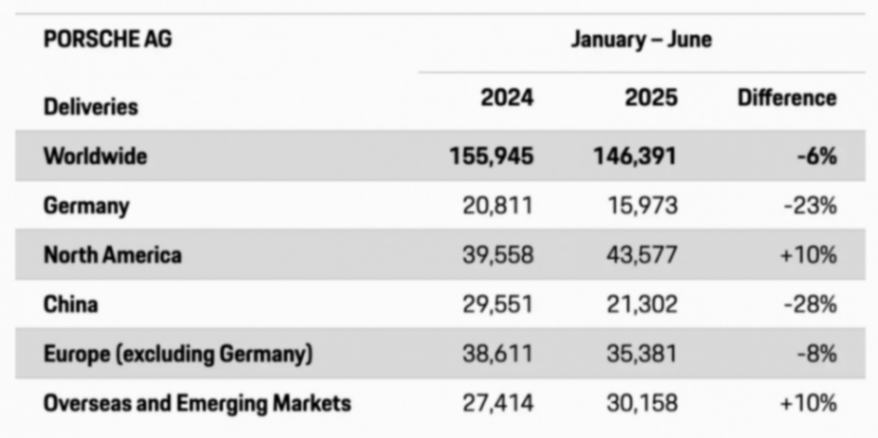 顯然,從保時捷官方發布的數據來看,2025年上半年,其在全球市場的整體銷量呈現出一定的下滑態勢。