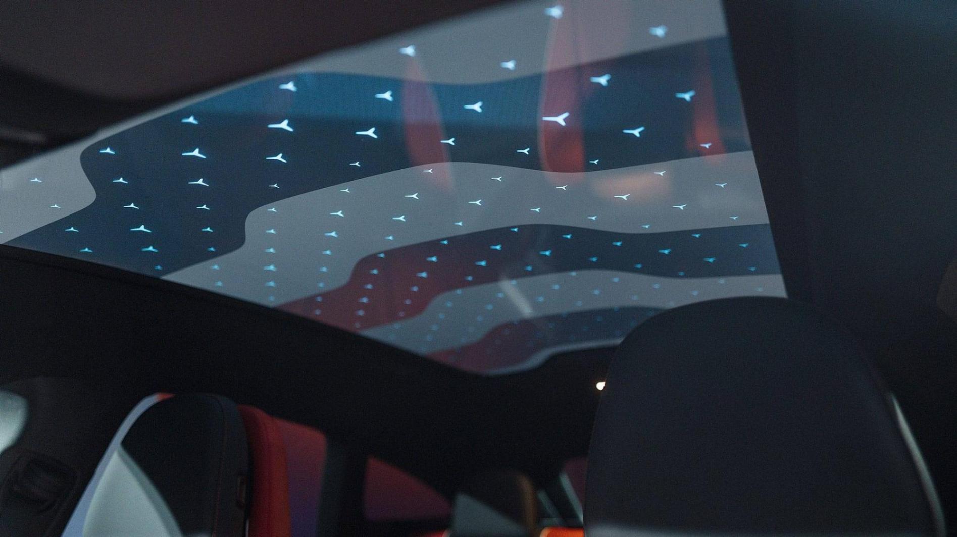 我們都知道,全景天窗能為車內帶來大量自然光,增強空間感。新車也采用了熱能隔絕層及紅外反射涂層,可有效阻擋熱量,還可選配通過按鍵逐段調節玻璃天窗的遮光程度,有效防止窺視。天窗還內置氛圍燈系統,與車內環境照明聯動,可點亮158顆“星徽”圖案,為夜間行車增添浪漫氛圍。