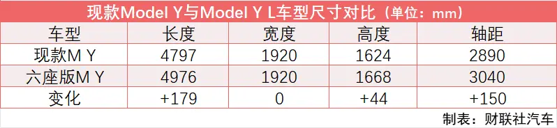 與現款在售Model Y相比,六座版新車長度由4797mm加長179mm至4976mm;軸距及高度等亦有增加。