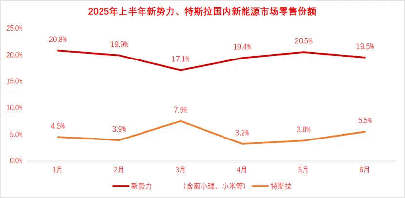 數據顯示,2025年上半年新能源零售份額中,新勢力(蔚小理、小米等)同期占比為19.5%,同比增長4.5個百分點,特斯拉同期占比為4.7%,同比下降1.6個百分點。