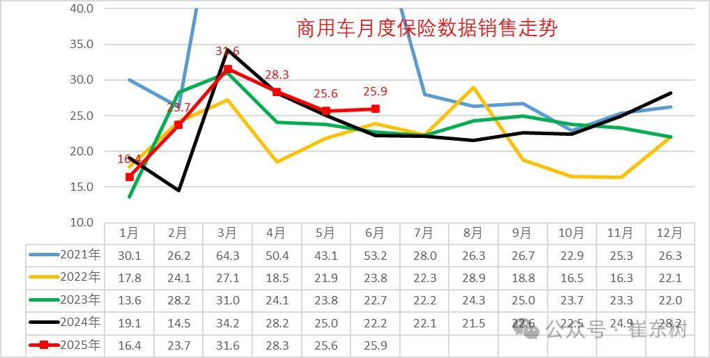2025年商用車車市呈現1月的春節前置帶來的2-6月的持續走強的走勢特征。由于春節較早,車市節后啟動也較早。今年1月商用車月度數據環比下降較大,2月商用車銷量23.7萬臺,屬于歷年的銷量中位。3月商用車銷量達到31.6萬臺,實現持續拉升的良好走勢。4-5月商用車銷量環比降速較慢,6月商用車銷量達到25.9萬臺,環比創出當月的近期歷史新高。