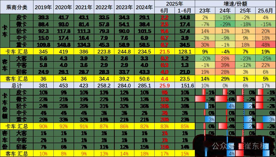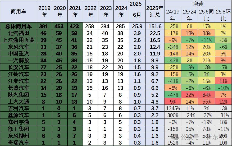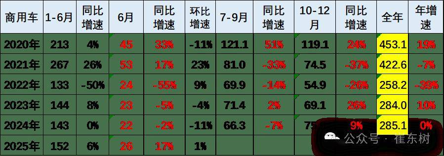 6月商用車國內銷量實現26萬臺,同比增17%,環比增1%。2025年1-6月商用車國內銷量實現152萬臺,同比增長6%,相對于2023年和2024年的商用車平穩期,在2021年創出峰值后,今年創出2022年后的近幾年新高的良好水平。