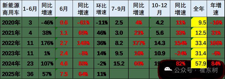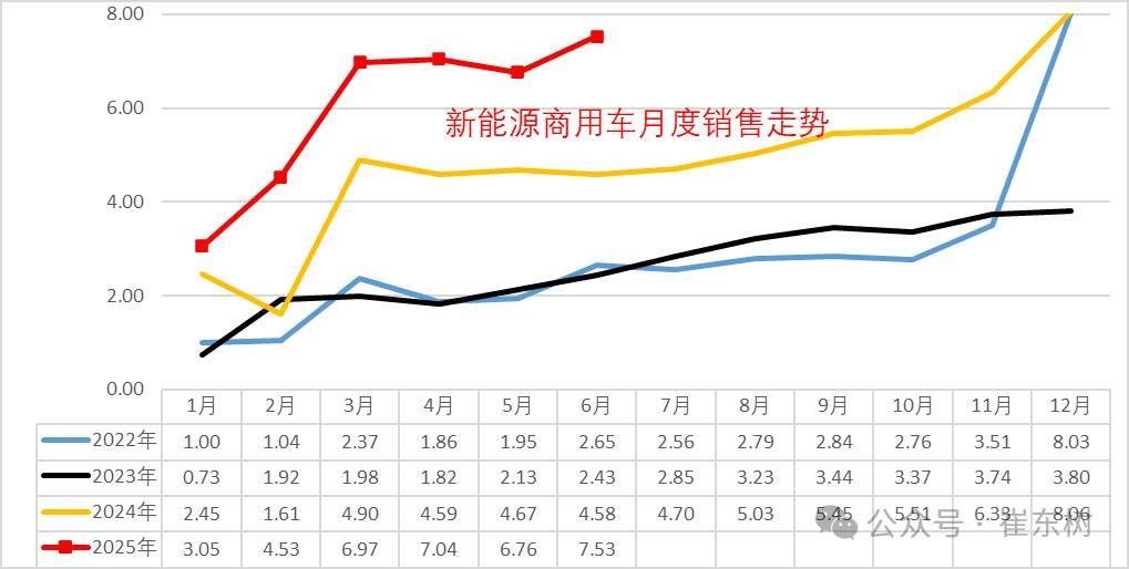 2025年新能源商用車整體呈現快速拉升的良好局面。3-6月持續高位,新能源增長較強。2025年6月的新能源銷量迅速達到7.5萬臺的高位,說明新能源的需求旺盛。