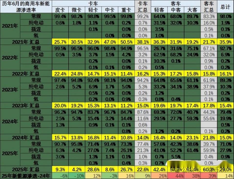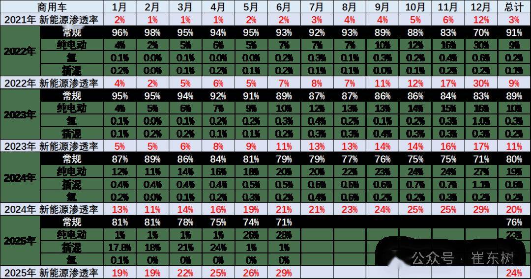 從2019-2021年,整個新能源商用車的滲透率在3%左右水平,2022年達到9%,2023年達到11%,2024年全年達到20%,2025年1-6月就達到滲透率24%的良好水平,體現了新能源商用車強勢增長良好態勢。
