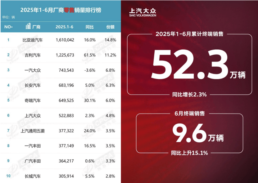 以上汽大眾為例,6月,上汽大眾銷量同比增長15.1%,跑贏大盤;2025年1-6月,上汽大眾零售銷量52.3萬輛,位居國內零售銷量車企排行榜第六。