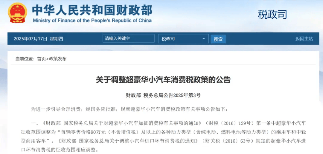 近日,《財政部國家稅務總局關于調整超豪華小汽車消費稅政策的公告》發布:自7月20日起,零售環節消費稅征收門檻由不含增值稅130萬元/輛下調至90萬元/輛,同時首次把純電、燃料電池等所有動力形式的乘用車及中輕型商用客車納入征稅范圍,稅率維持10%不變。消息落地后,業內普遍認為,90萬—130萬元價格帶將成為“重災區”,多個熱銷車型恐遭“滅頂之災”。