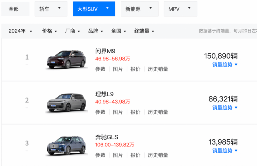 理想和問界在全尺寸SUV市場,幾乎是橫著走的。2024年,問界M9一口氣賣了15萬輛,理想L9也取得了8.6萬輛的成績,兩者合起來直接拿走了這個市場八成以上的份額,“吃”得盆滿缽滿。