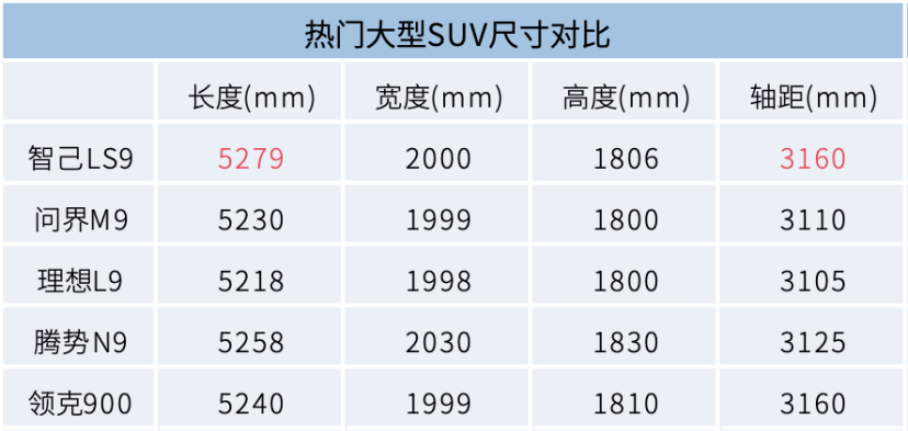 智己LS9的車身尺寸在同級車型中極具優(yōu)勢,長、寬、高分別為5279mm、2000mm、1806mm,軸距為3160mm,比理想L9、問界M9略大,內(nèi)部空間自然也不小。
