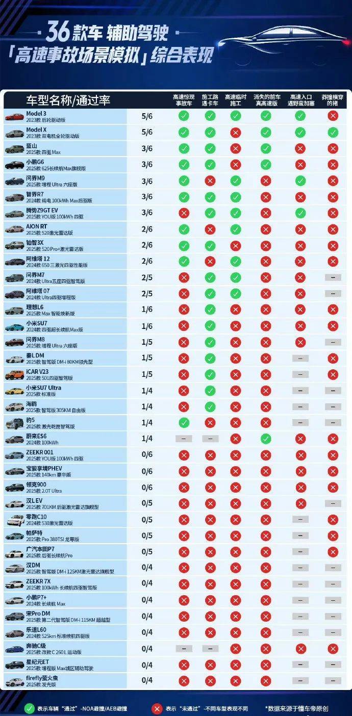此次參與測試的車輛有36輛不同品牌的智駕車型,涵蓋了特斯拉、問界、小鵬、小米、蔚來、理想、、阿維塔、智界等熱門的智駕品牌。但最終的結果令人大跌眼鏡。