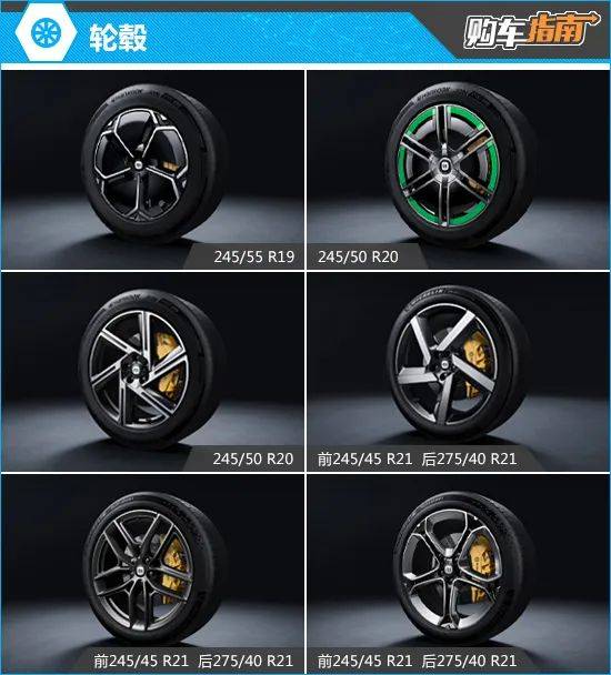 輪轂方面,三款車型標(biāo)配19英寸鉆石輪轂,采用雙色設(shè)計(jì),視覺效果不錯,與之匹配的輪胎規(guī)格為245/55 R19。頂配車型還提供了5款輪轂可選,其余兩款車型提供4款輪轂可選,均是頗為前衛(wèi)、動感的造型。