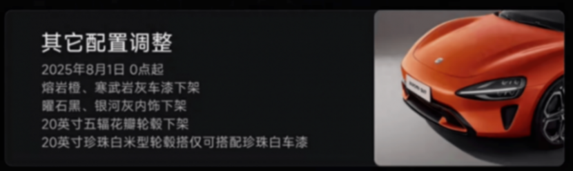 7月25日,小米汽車在最新發(fā)布的答網(wǎng)友問中正式回應(yīng)近期產(chǎn)品配置調(diào)整決定:自8月1日零時(shí)起,小米SU7和小米SU7 Ultra將下架熔巖橙、寒武巖灰兩款車漆顏色,曜石黑與銀河灰內(nèi)飾,以及20英寸五輻花瓣輪轂等配置選項(xiàng)。這一調(diào)整迅速引發(fā)市場關(guān)注。