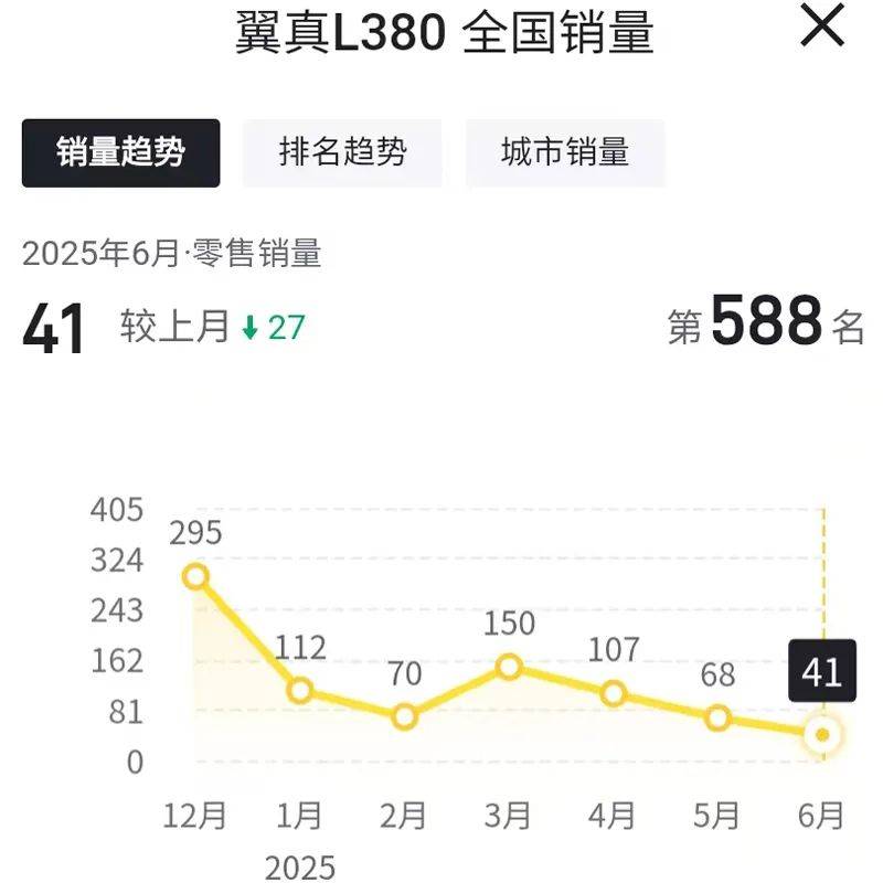 比如,今年6月份,翼真L380的銷量為41輛,相比今年5月份的銷量68輛,環(huán)比下滑39.7%,連續(xù)3個月呈現(xiàn)下滑趨勢。同時,今年1-6月份,翼真L380的累計銷量也只有548輛,半年的累計銷量不足600輛。