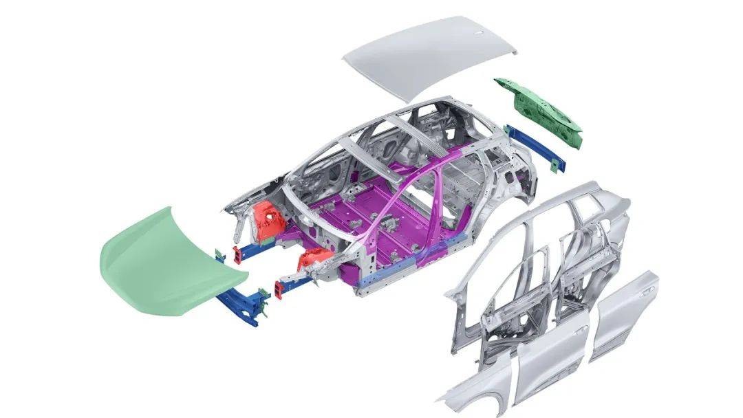 圖丨最新的Q6L e-tron車身構造示意圖,紫色部分使用了2150MPs熱成型鋼