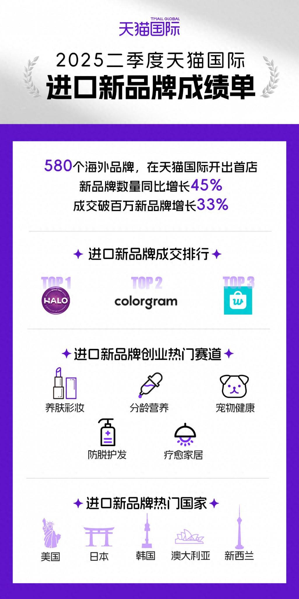 8月5日天貓國際的發(fā)布2025二季度全球超新星品牌榜顯示,美國寵物品牌Halo自然光環(huán)、韓國彩妝品牌Colorgram和K-POP周邊品牌Weverse Shop位列前三。據(jù)了解,這份榜單基于旗艦店生意規(guī)模、品牌影響力、消費(fèi)者喜愛度三個(gè)維度,每季度選出成長迅速的進(jìn)口新銳“尖子生”。
