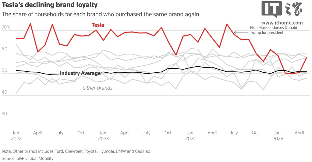 8 月 5 日消息,據 S&P Global Mobility 最新發布的數據,特斯拉的品牌忠誠度從行業領先水平跌落至中等水平,而這一變化似乎與公司首席執行官埃隆?馬斯克的行為密切相關。