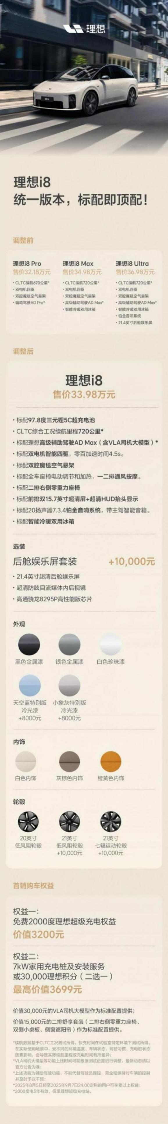 理想汽車決定統一配置版本——以理想i8 Max作為標準配置,并將售價從34.98萬元調整為33.98萬元,同時額外贈送價值10,000元的鉑金音響,并提供后艙娛樂屏套裝作為選裝,價格10,000元;原以36.98萬元選擇Ultra版本的用戶,只需要34.98萬元的價格即可實現原選擇的全部配置;原選擇Pro版本的用戶,可以選擇退訂或升級,提供專屬服務。