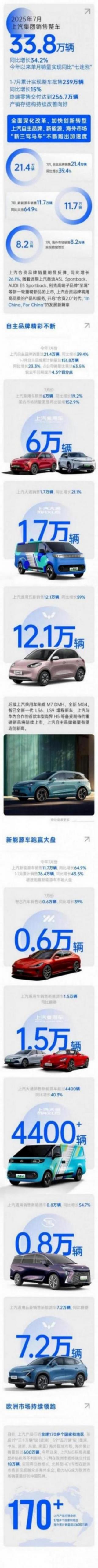 2025年8月3日,上汽集團發(fā)布7月產銷數(shù)據(jù):單月銷售整車33.8萬輛,同比增長34.2%,實現(xiàn)連續(xù)7個月同比正增長;1-7月累計批售239萬輛,同比增長15%,終端零售達256.7萬輛,產銷結構持續(xù)優(yōu)化。增長動能主要來自自主品牌、新能源、海外市場三大核心板塊,同時合資品牌企穩(wěn)回升。
