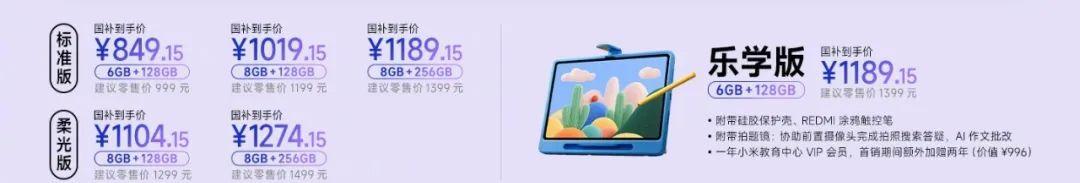 先說說這一閃耀的版本,價錢壓得死死的-6 128GB版999元,8 128GB要1199元,頂配8 256GB也只有1399元。如果你打算給熊孩子用,沒什么好猶豫的,直接沖柔光,帶來的護眼效果不怕沖著燈奪目,8 128GB柔光1299元,8 256GB柔光1499元。誰能回絕849.15塊的發展費?還有一個樂學版,主打是給學生裝備齊全,6 128GB標價1399元,組合硅膠機殼、涂鴉筆和拍題鏡,覺得小孩到手真的想要什么功能。