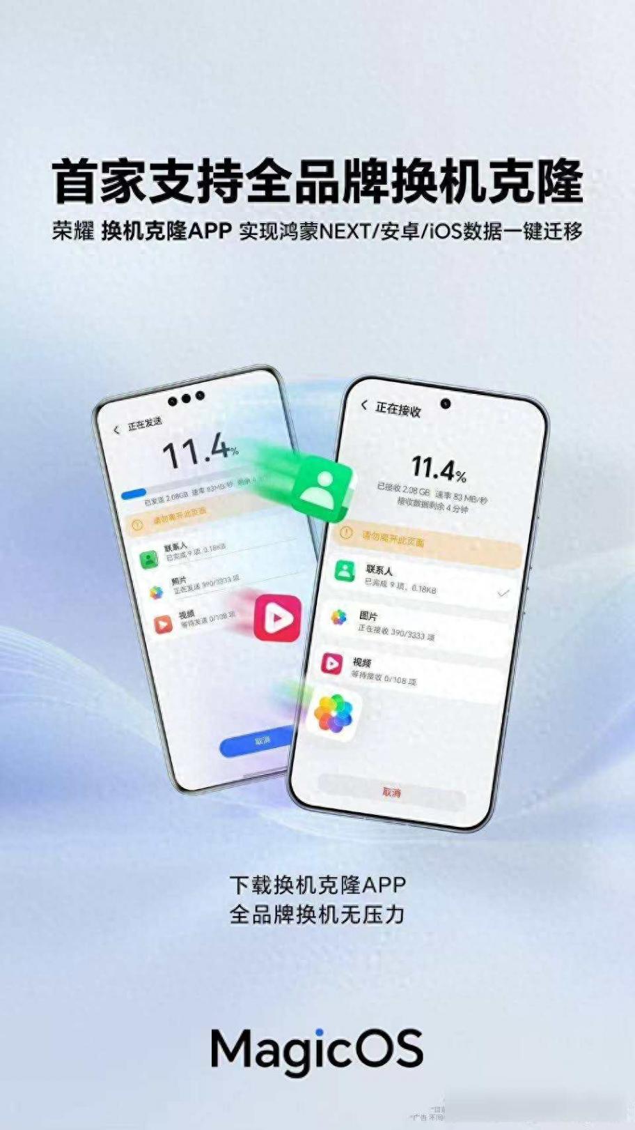 榮耀最近宣布,他們手機(jī)系統(tǒng)MagicOS 9.0能跟華為鴻蒙、蘋(píng)果iOS還有安卓手機(jī)互相換機(jī)了。用戶(hù)裝個(gè)“換機(jī)克隆”APP,就能把通訊錄、照片這些數(shù)據(jù)直接傳到新手機(jī)?,F(xiàn)在Magic V5已經(jīng)能用,這個(gè)月其他型號(hào)也會(huì)開(kāi)通。