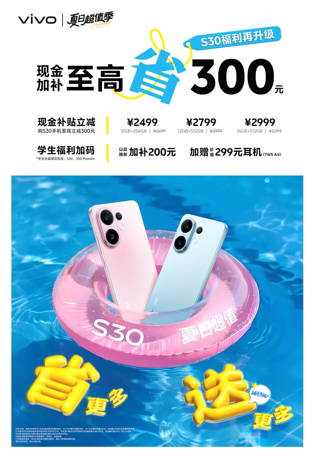 優惠政策同樣誠意十足,以舊換新享200元補貼,還能免費獲得TWS A4無線耳機一副,總體最高優惠近500元。不僅如此,還有分期免息、專屬配件贈送等福利。vivo S30此次的暑促策略,真正做到了“高顏值+強性能+高性價比”的三重疊加,想換機的朋友,這波夏日福利千萬別錯過。