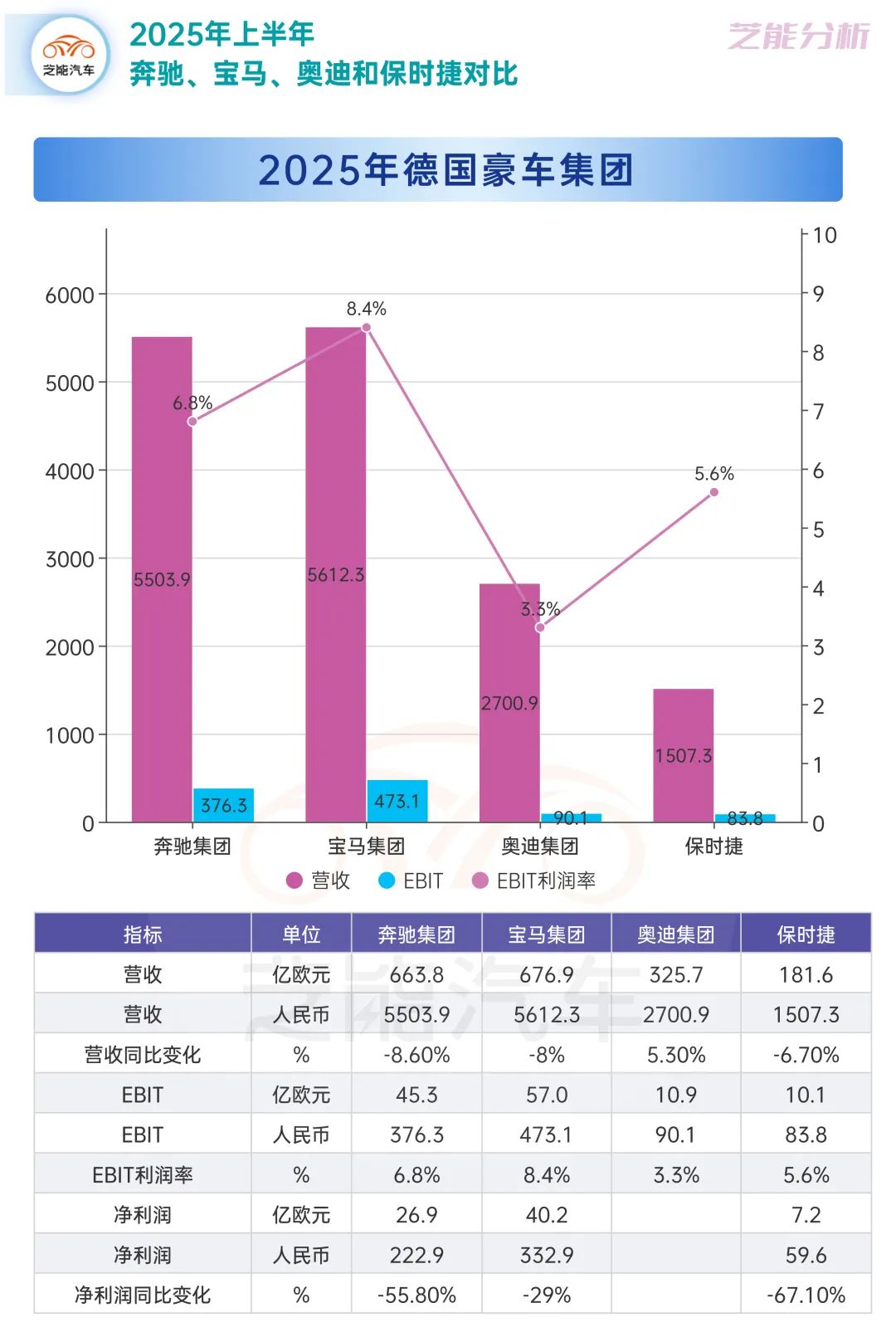 ● 奔馳集團上半年營收為663.8億歐元,同比下降8.6%,折合人民幣約5504億元,EBIT為45.3億歐元,利潤率6.8%,凈利潤跌幅達55.8%。
