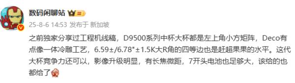 8月6日,有數碼博主曝光了D9500系列(天璣9500處理器)中杯和大杯的部分配置信息。結合該博主此前爆料的信息和評論區的信息來看,博主提到的D9500系列中杯和大杯應該是OPPO Find X9和OPPO Find X9 Pro。