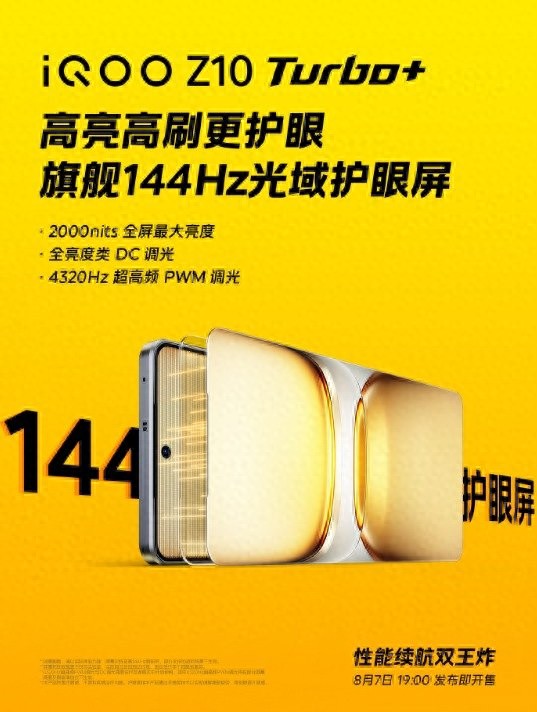 8 月 6 日消息,iQOO Z10 Turbo+ 將配備一塊高亮高刷護眼屏,最高支持 144Hz 高刷新率,全屏最大亮度也來到了 2000nit,助力流暢的游戲體驗。