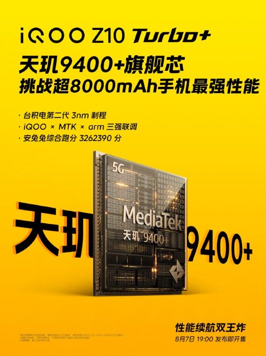 根據(jù)此前曝光的消息,iQOO Z10 Turbo+ 將搭載天璣9400+ 以及旗艦同款的自研電競芯片Q2,帶來更清晰、更流暢的游戲畫面。還有 8000mAh 的超大容量電池,持久暢玩不斷電。