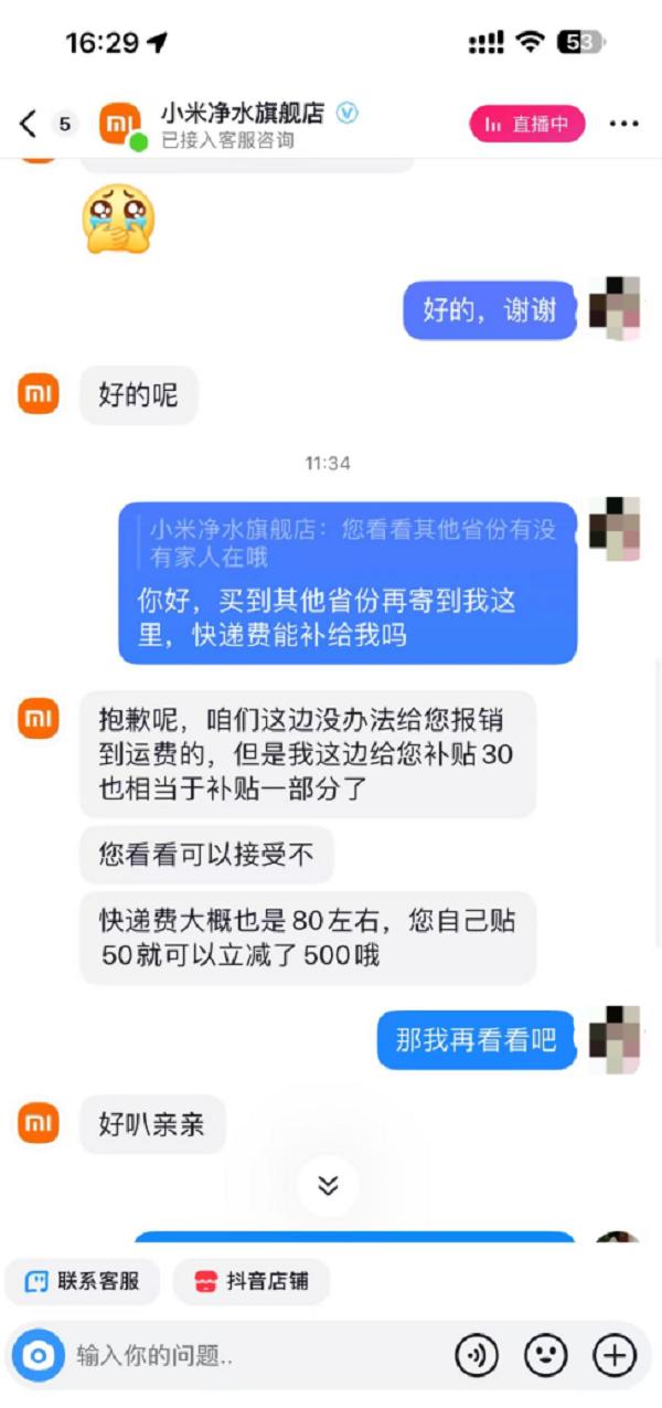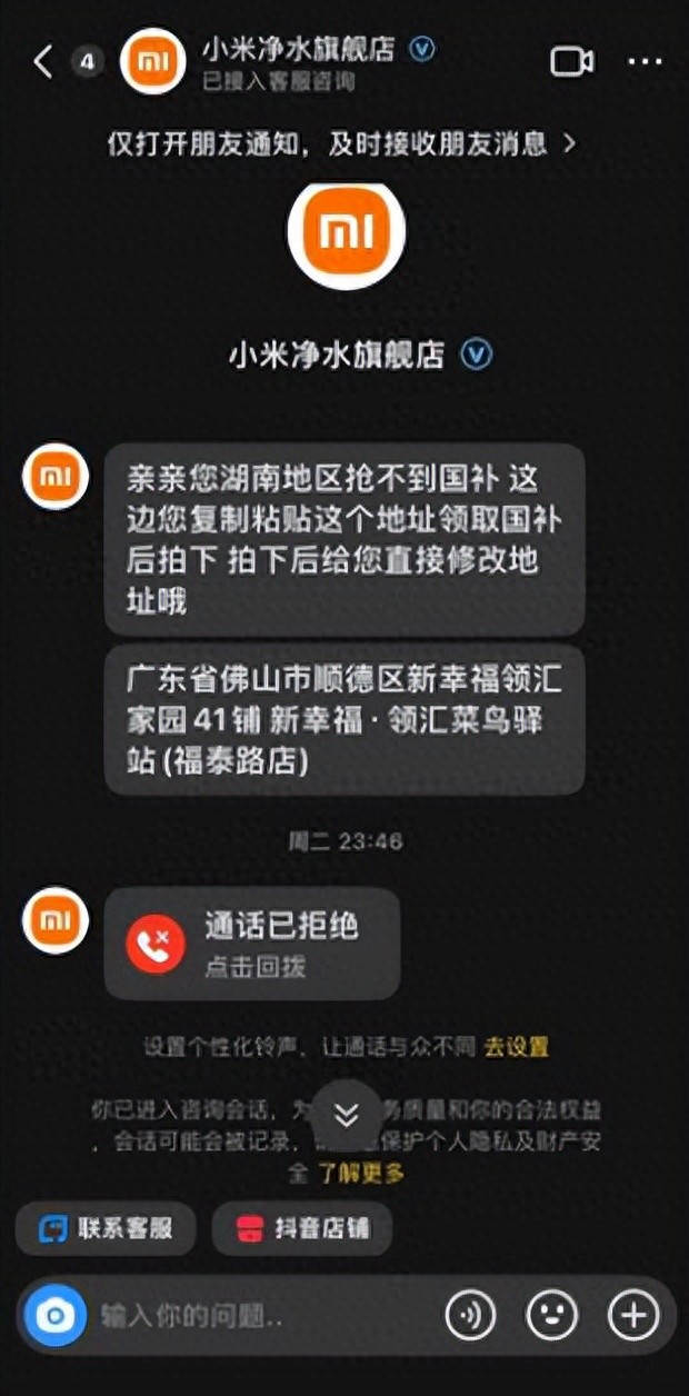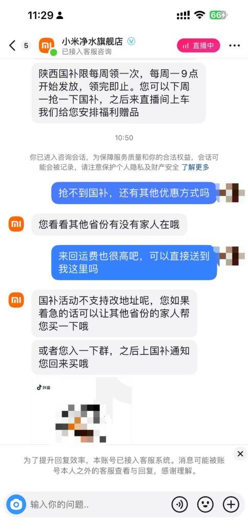 近日,湖南長沙一消費者稱,他在某音“小米凈水旗艦店”的直播間想購買一臺凈水器,因其搶不到所在地區的國家補貼(國補),直播間工作人員表示可以解決。隨后,該消費者后臺咨詢“小米凈水旗艦店”客服人員,對方讓消費者將收貨地址改為廣東佛山的一個地址,就可以享受“國家補貼”。